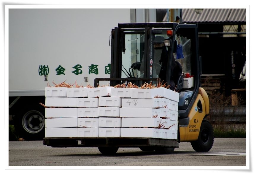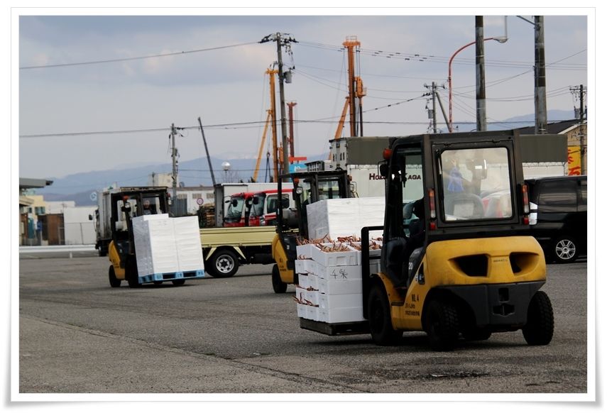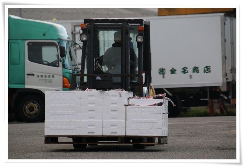 フォークリフトに発泡のトロ箱を乗せて漁連のある方へ移動し始めました