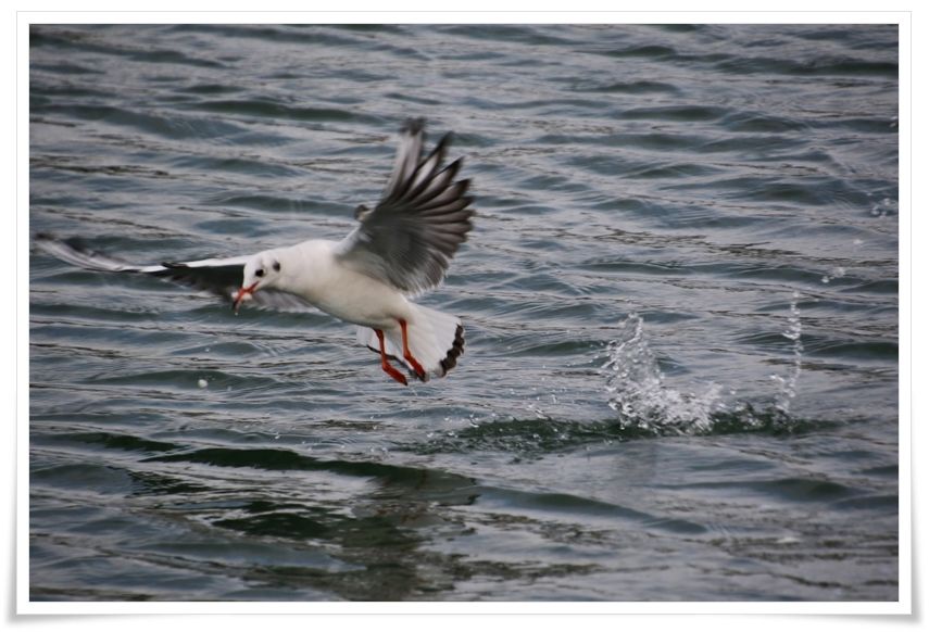 ユリカモメ が水面からパンを上手にキャッチしていくのを観察しています