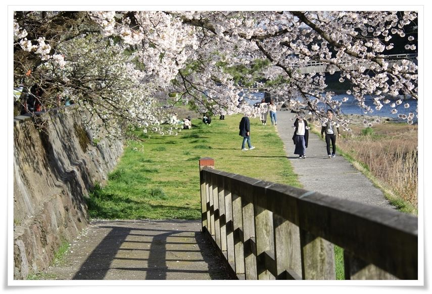 遊歩道へ降りる途中で振り返って桜と一緒に