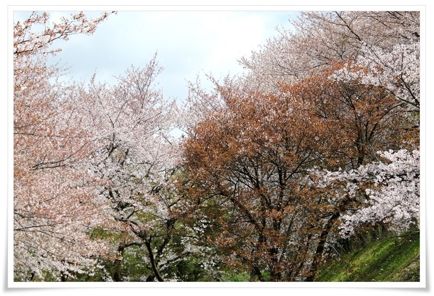 ほとんどが ソメイヨシノ だと思うけど、赤っぽい葉っぱが目立っているのは 山桜 かな・・・・・・