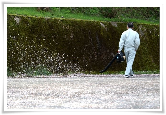 ブロアーで散った桜の花びらを吹き飛ばしている職員さんがいたよ