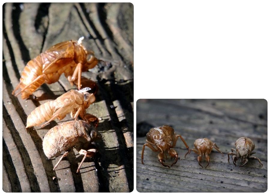 後から地上に出て来た幼虫は、前に羽化した抜け殻にしがみつくようにして羽化したようです