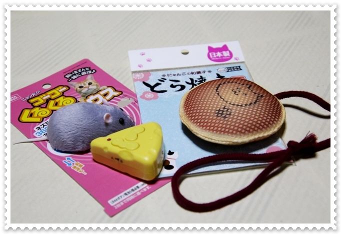 今回のおもちゃは、紐の先にスポンジで出来たどら焼きの形をしたおもちゃと