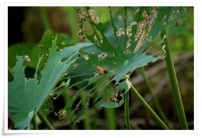 虫食いの痕だらけのハスの葉っぱ