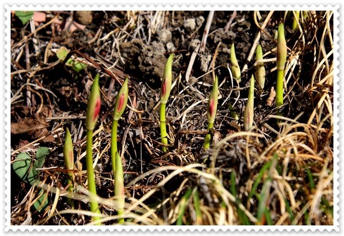 だって我が家の前庭はやっと花芽が出たばかりなんだもん