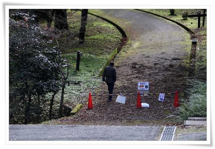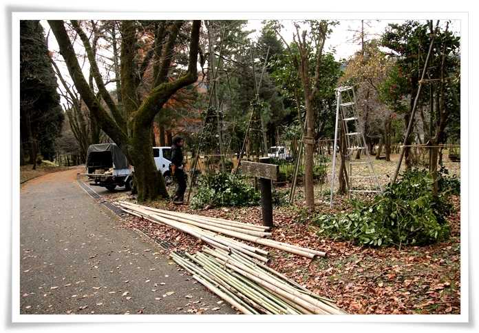 花木園 では業者さんが枝を切ったり支柱を立てて縄で縛ったりの冬支度の真っ最中