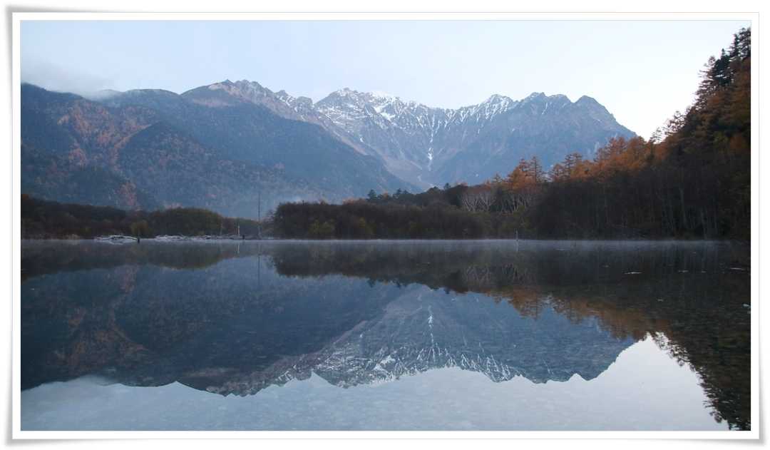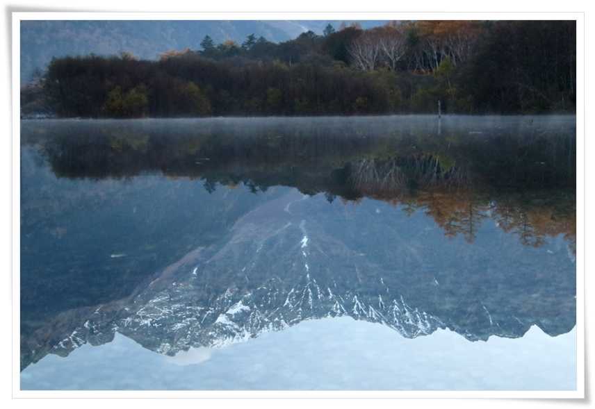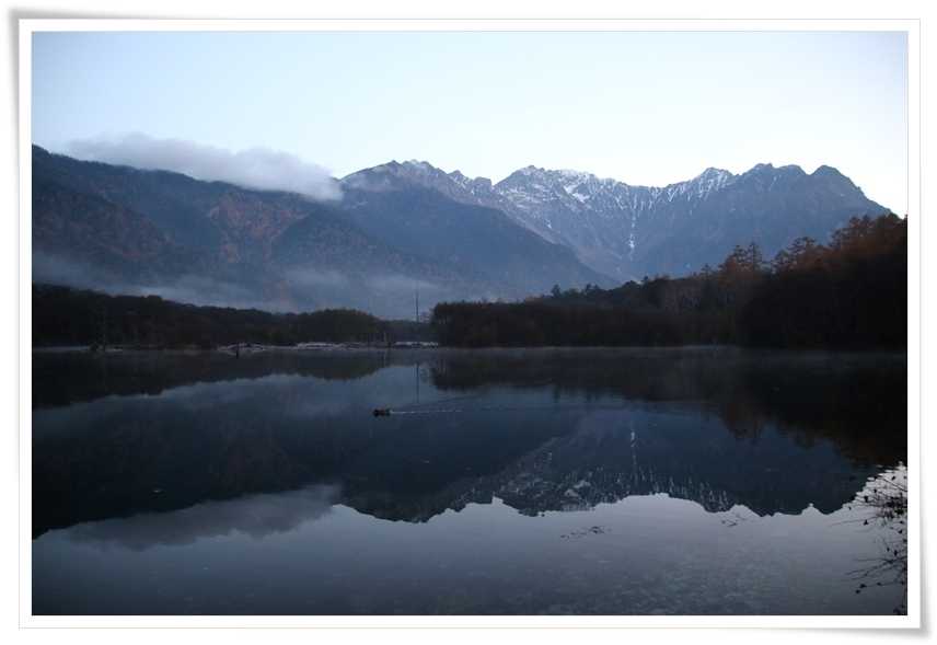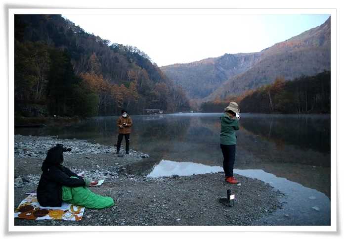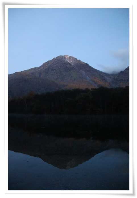 明るくなってくると湖面に写り込む 焼岳 の姿がハッキリと見えるようになってきました