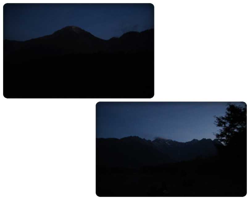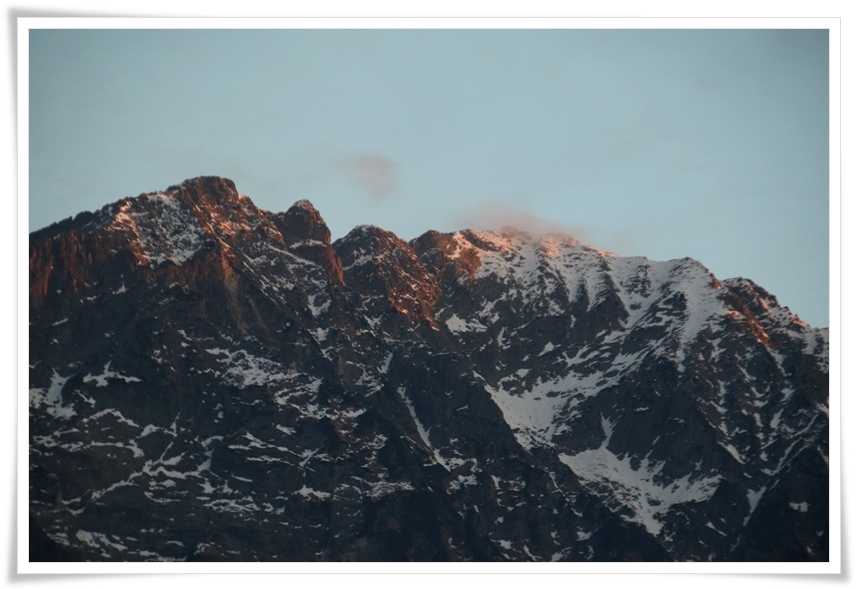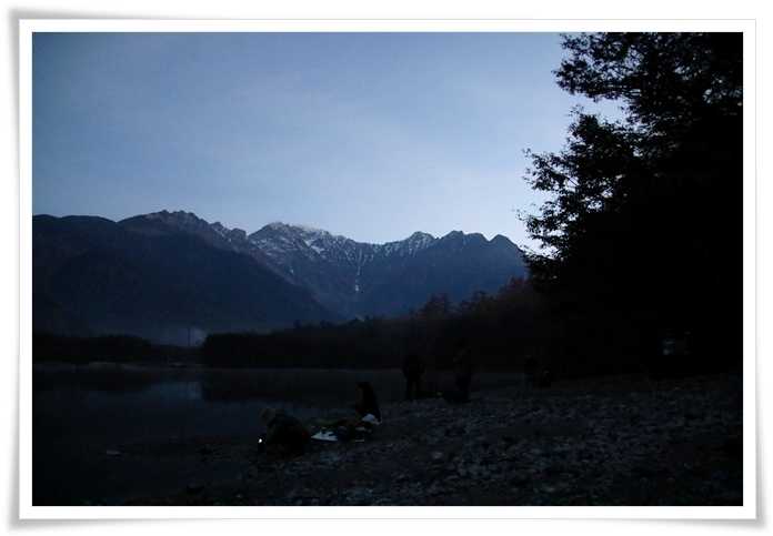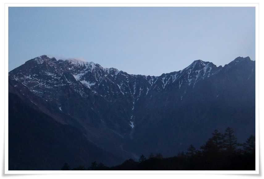 穂高連峰の中で一番標高の高い 奥穂高岳 の頂上付近が少し明るくなっているのが分かるでしょうか