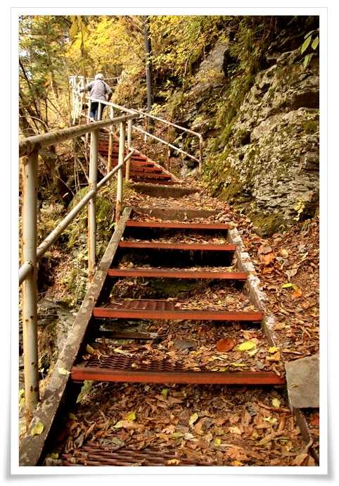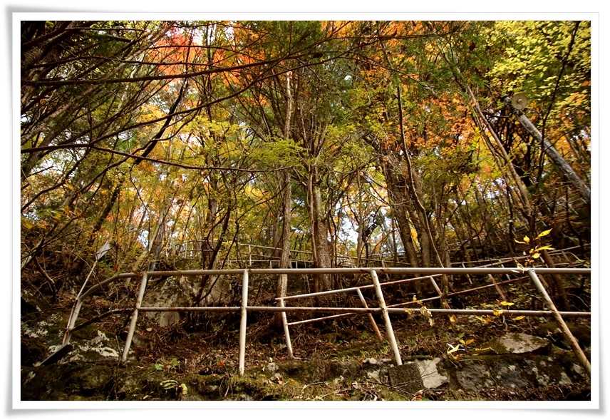 階段がもうすぐ終わる辺りには色付いたモミジが有って