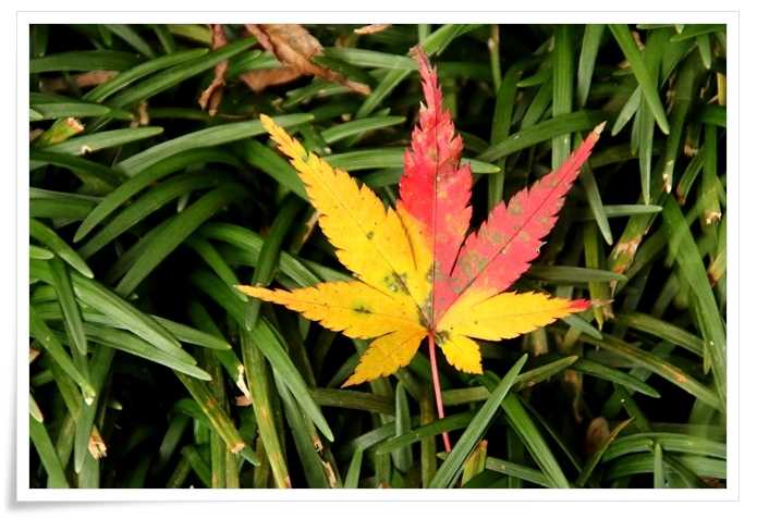 リュウノヒゲ の上に落ちが色合いが素敵な落ち葉