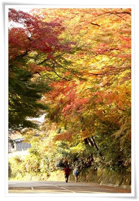 道路沿いにモミジの様子を見ながら坂道を下ってを目指します