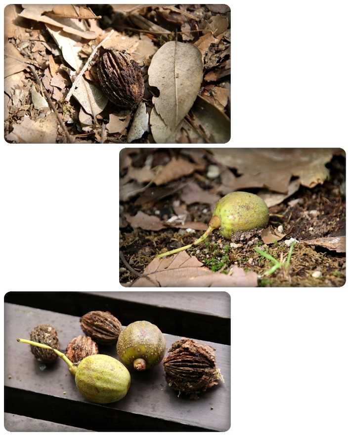 地面に落ちたまだ若い実と、昨年落ちて果肉が無くなった古い種をいくつも見つけたよ