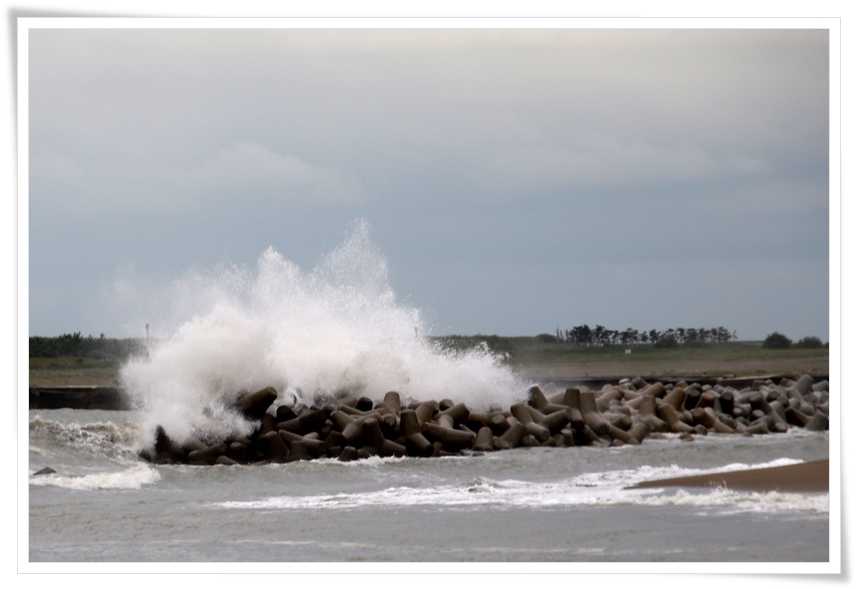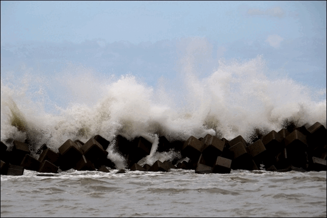 テトラポットに波がぶつかり大きな波しぶきが上がっていました