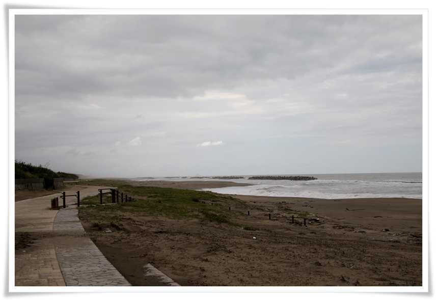 海岸に打ち寄せる波も砂を舞い上げて茶色に見えています