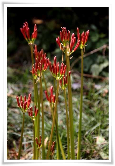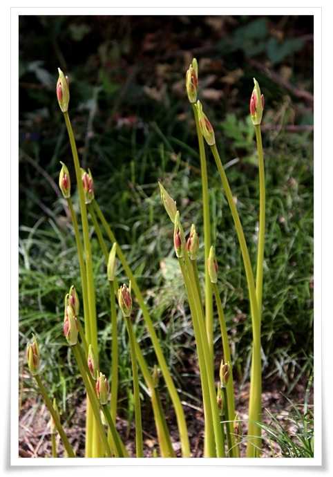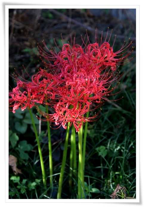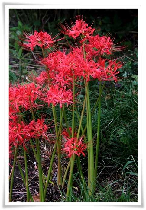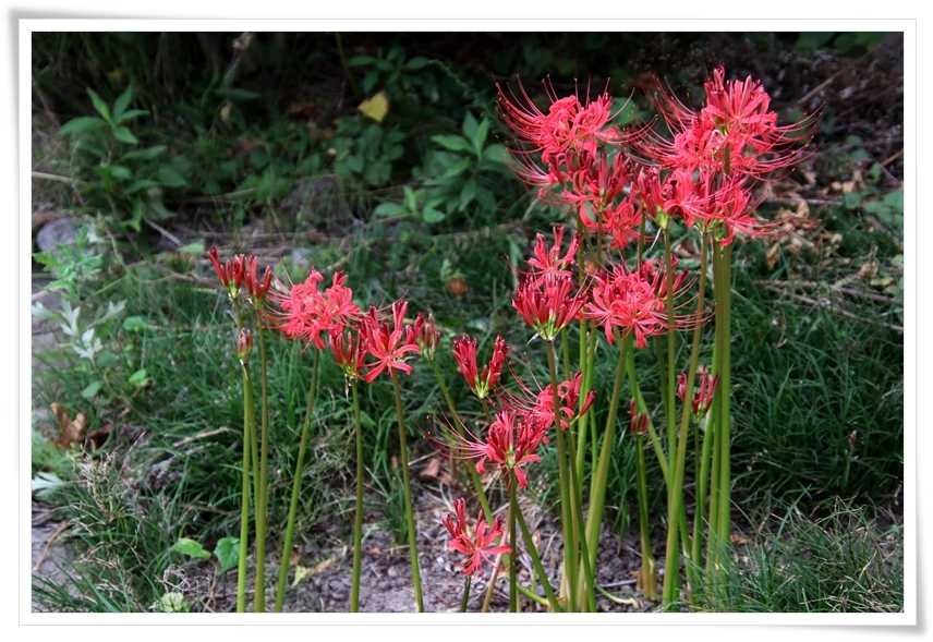 ここは彼岸花の群生地を訪れた時に地面の上に飛び出して転がっていた球根を持ち帰って植えた場所です
