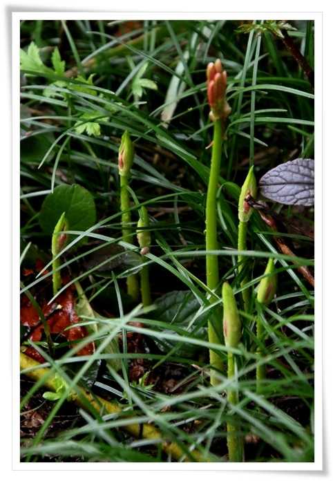 一番長く伸びてる花芽は先端の鞘の中にもう赤色の蕾の様子が見えています