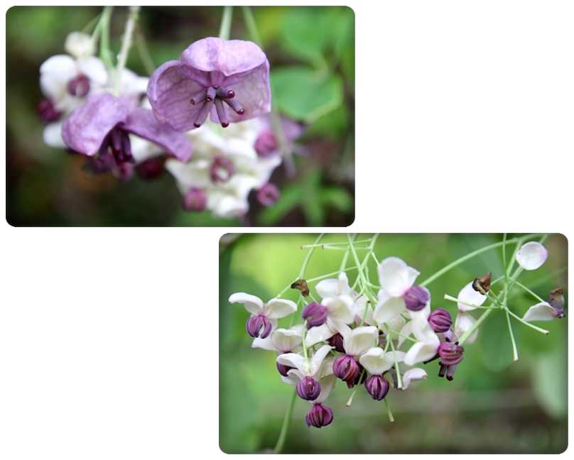 上の紫色の大きい花が雌花、下の白と紫の花が雄花です