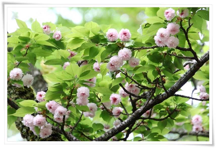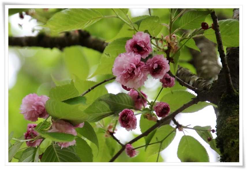 いつもの急勾配の坂道を上った先には八重桜がまだこんなに花を咲かせています
