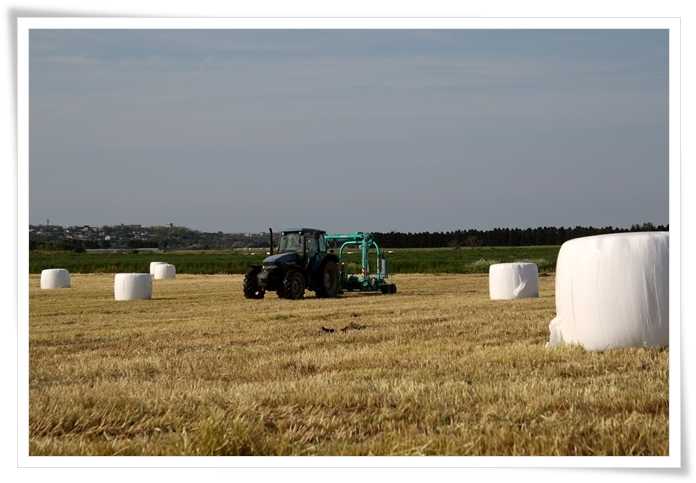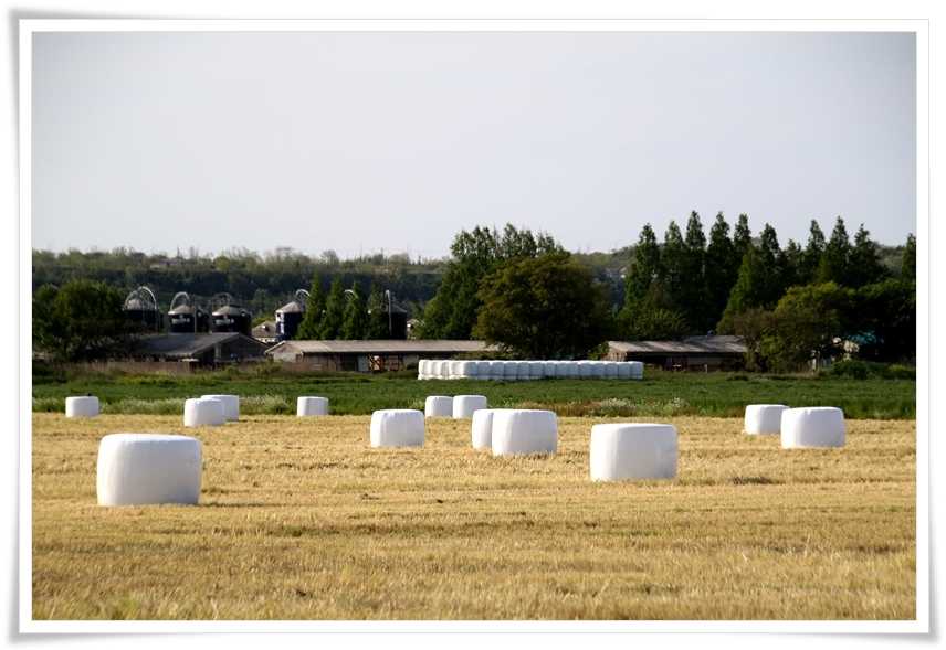 他の場所を見ると、等間隔に並んだビニールで巻き終わった牧草ロールが並んでいます