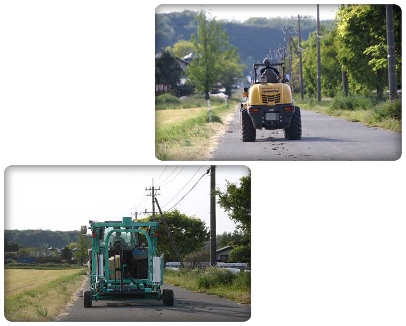 手前の黄色の車は、牧草ロールを挟んで移動させるための車