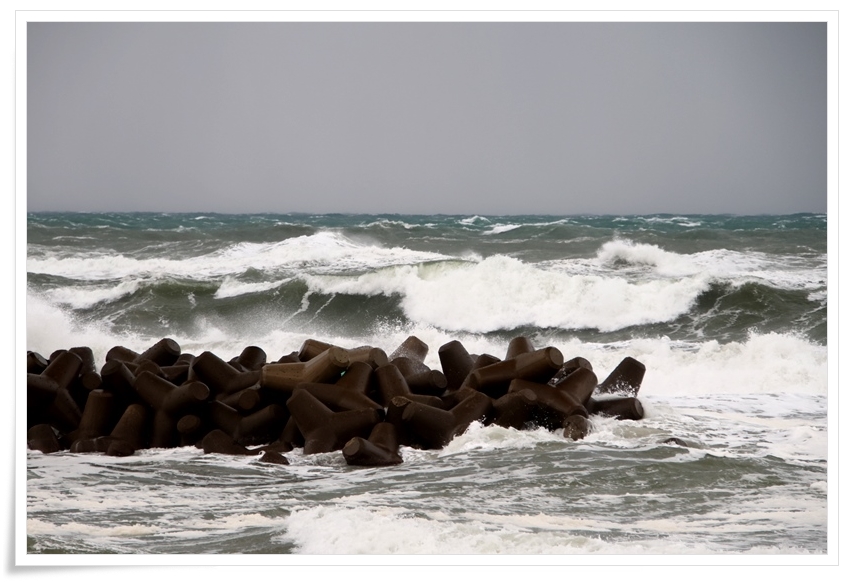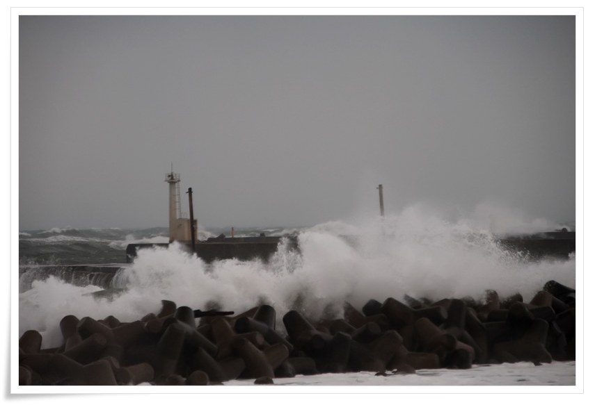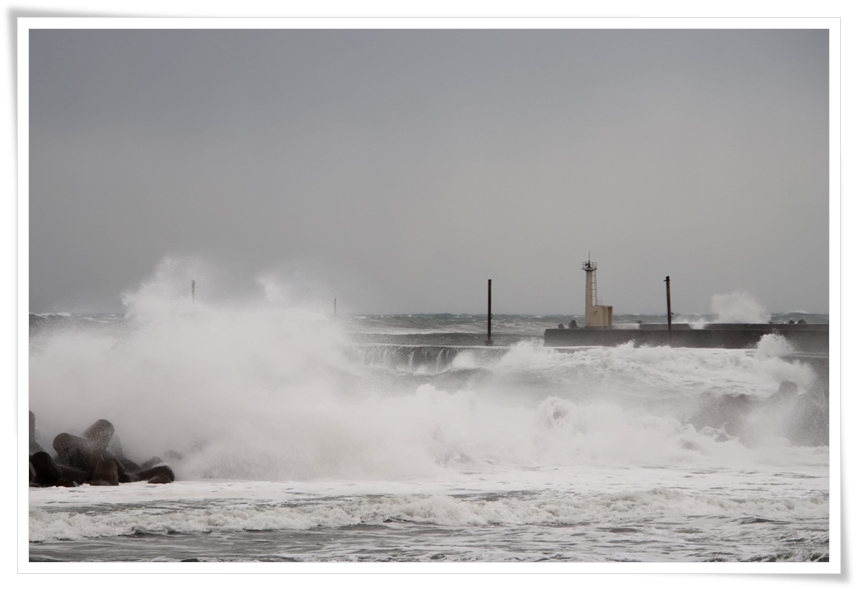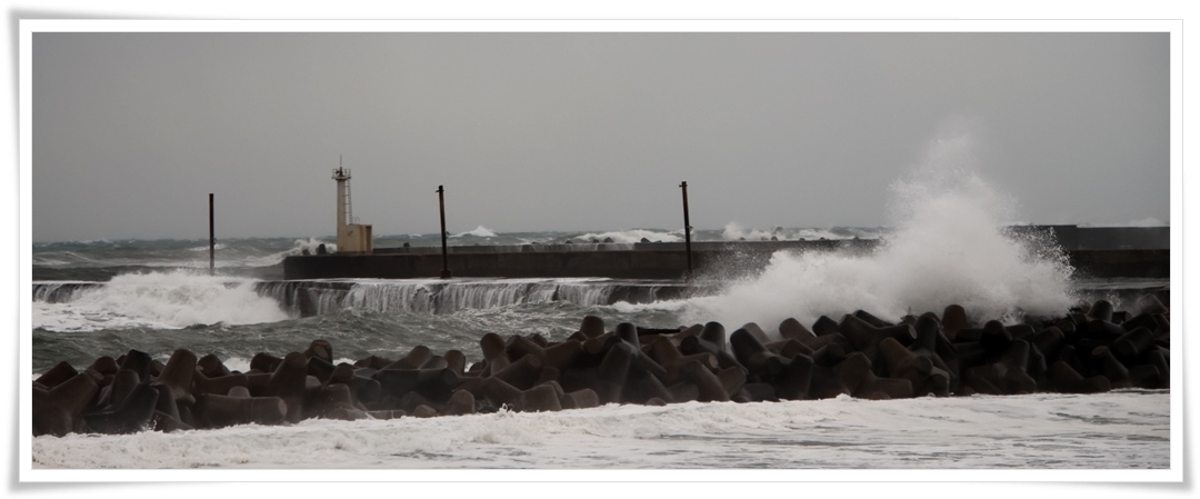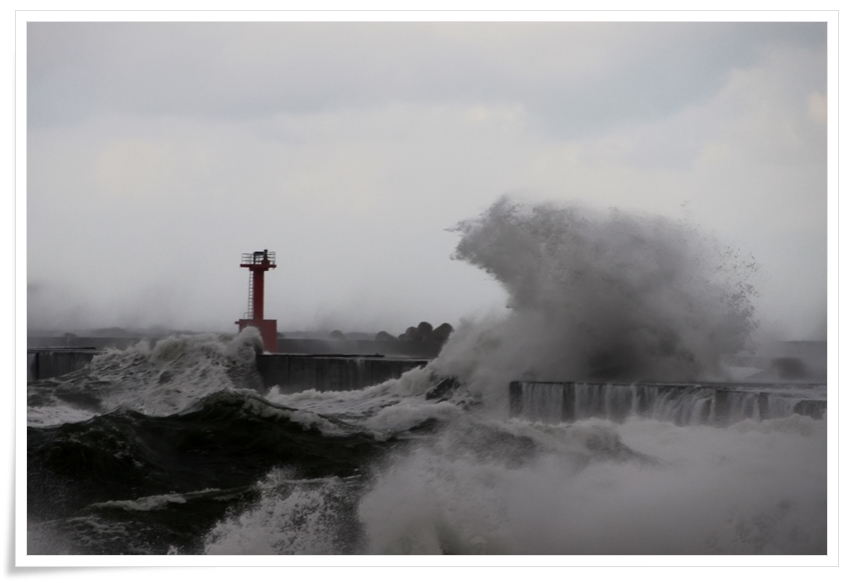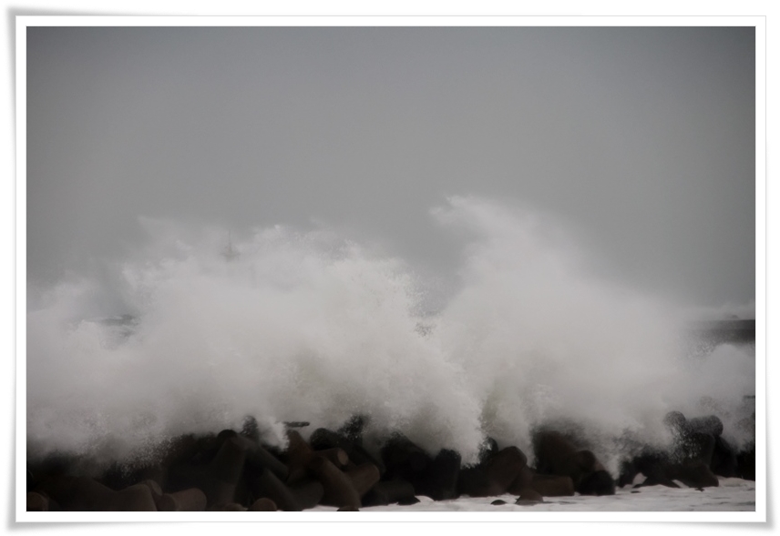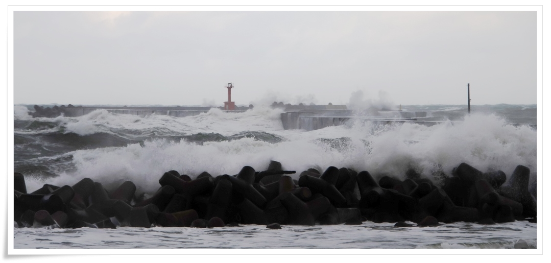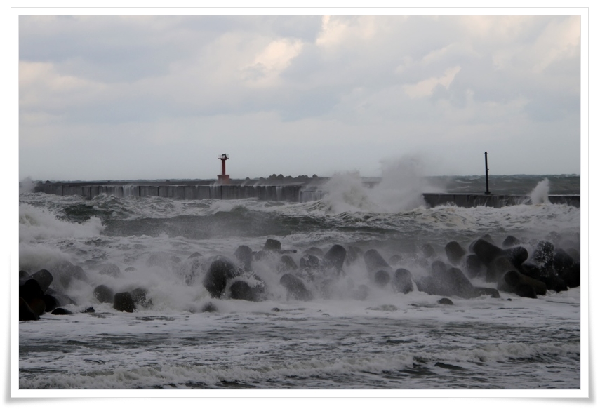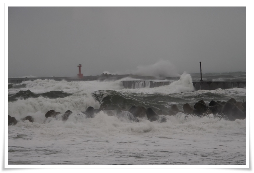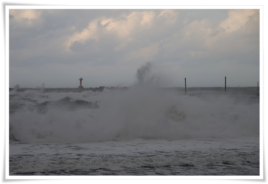 防波堤の上の電柱や灯台は波で見えなくなっています