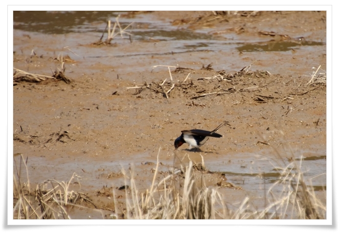 近くの田んぼに ツバメ がやって来て、田んぼの泥を運んでいるようです