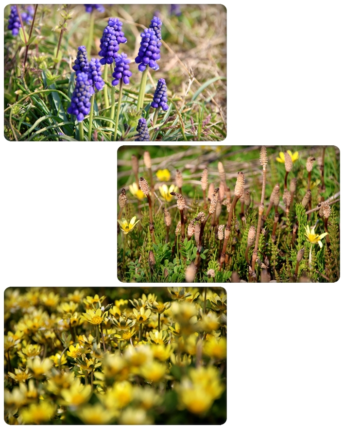 土手には 黄色の ​ヒメリュウキンカ​ ​土筆​ 、誰かが植えた ​ムスカリ​ が咲いていました