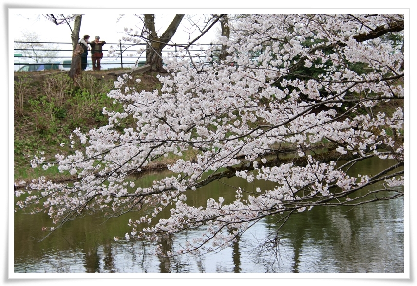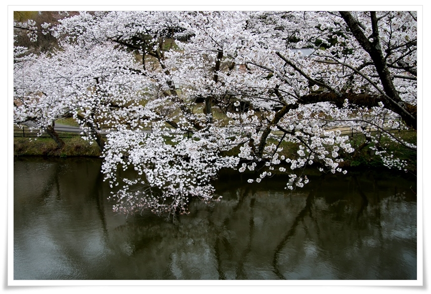 左岸に植えられた桜の枝、池の半分以上の長さまで伸びてるね