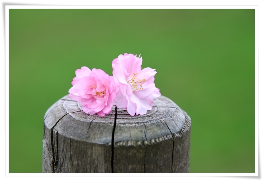 落ちていた八重の紅枝垂れを杭の上に乗せて