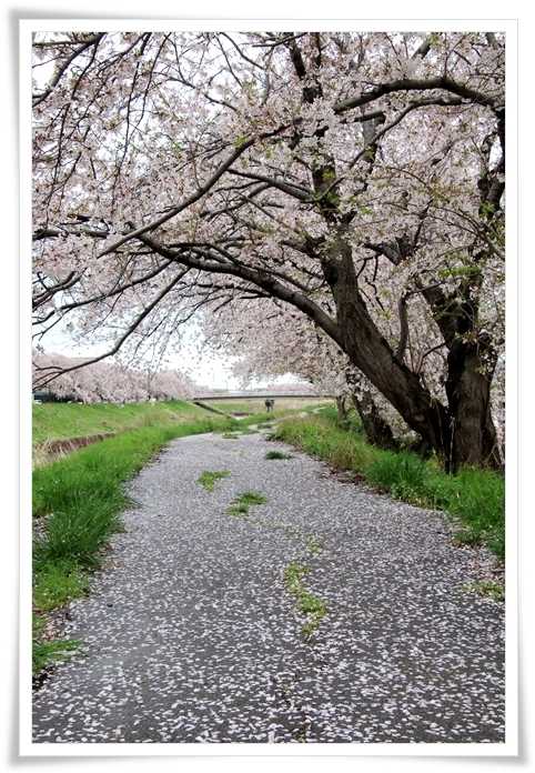 右岸の遊歩道も散り始めた花びらで薄っすらとピンク色になり始めています