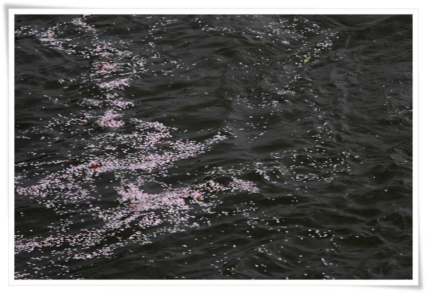 橋の上から見下ろす川面には、上流で散った花びらたちが小さな花筏を作って流れて来ています