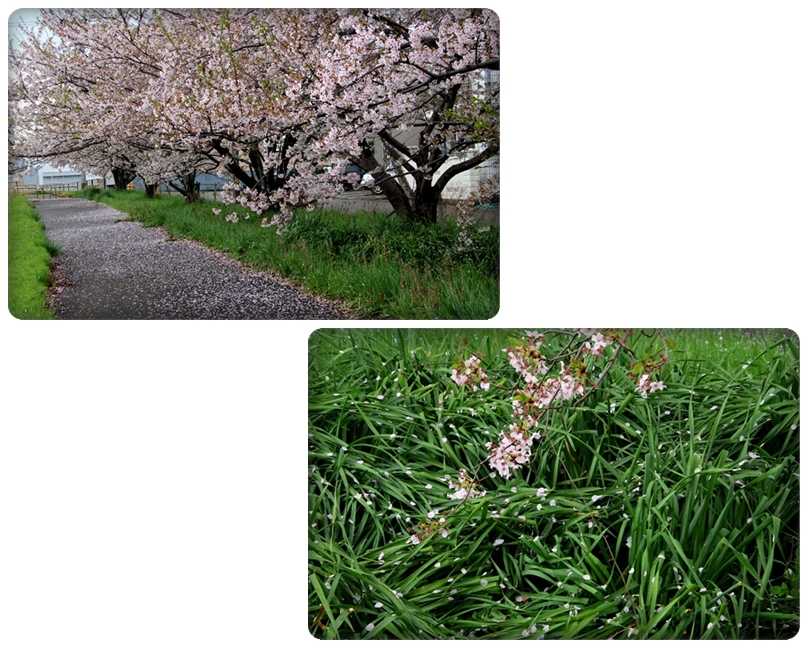 川沿いのの隅っこには風で拭き寄せられた花びらが・・・・・・・