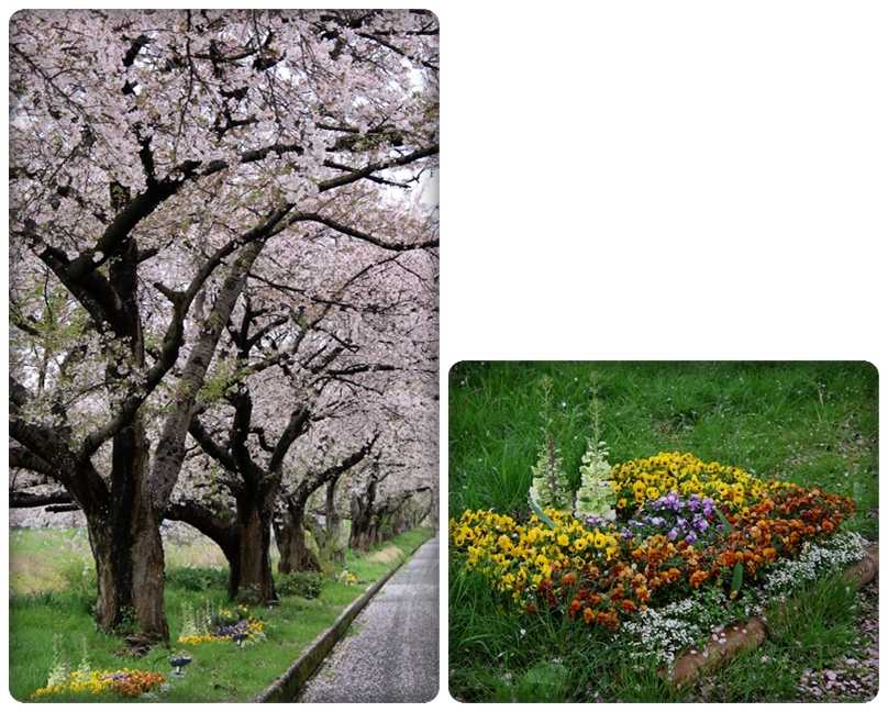 桜の木の下に作られた小さな花壇には桜の花びらのトッピング