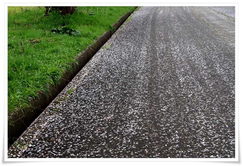 地面には散り始めた花びらの上に薄っすらと轍が見えているし