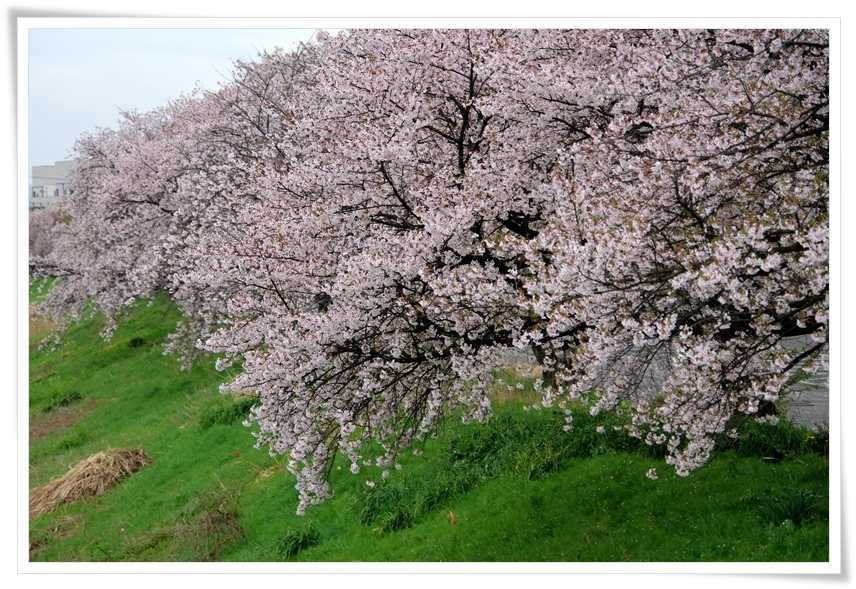 土手に生えている緑の雑草と色が濃く見えている散り始めた桜のコントラストはとても綺麗です