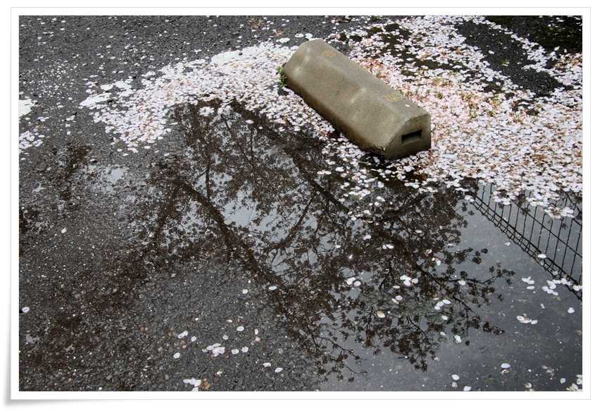 水溜まりにはまだ枝に残る花たちの姿も写り込んでいました