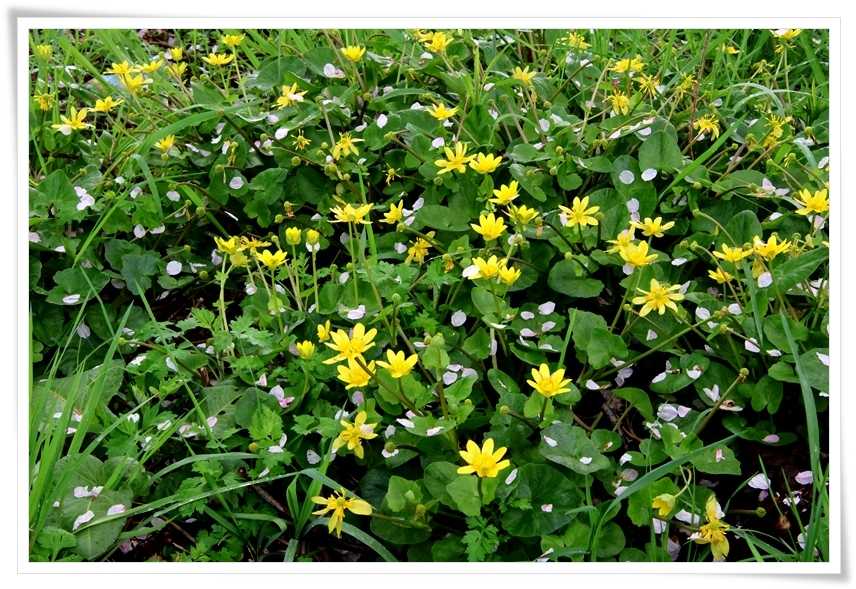 木の下の草むらには ヒメリュウキンカ の黄色の花の上にも桜の花びらたちが・・・・・・・