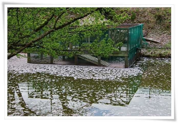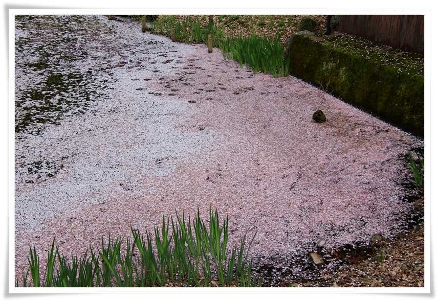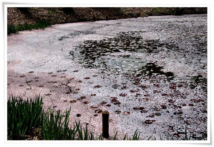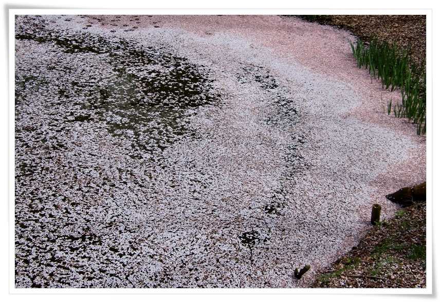 風に吹かれて花びらが池の隅っこに吹き寄せられたことで