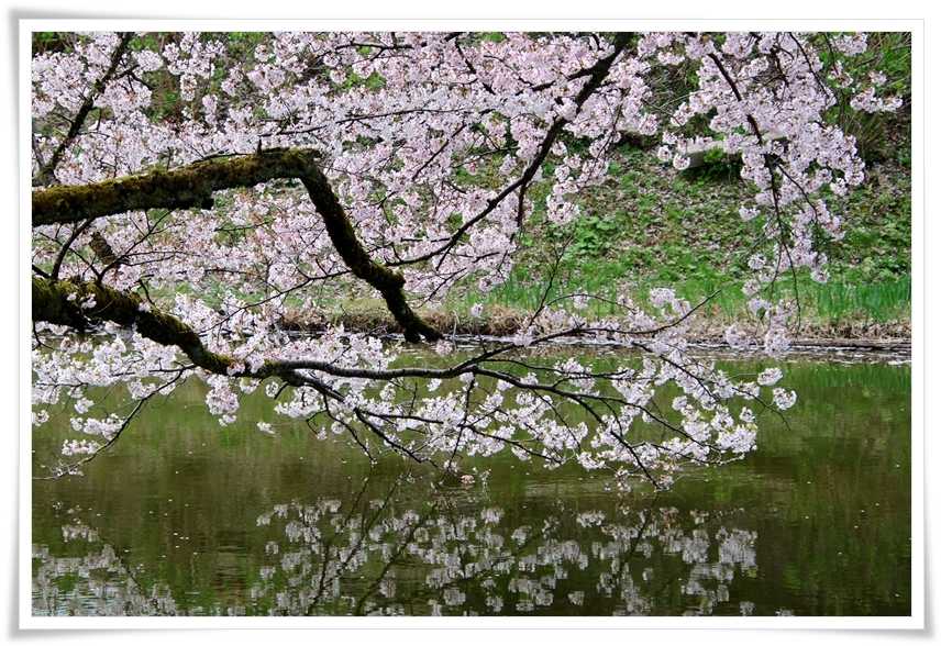 浮いている花びらと写っている桜の花の両方が有っていい感じかな