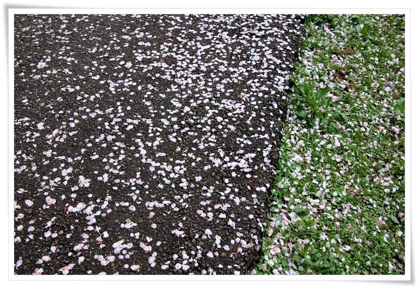 アスファルトの上にも草の上にも花びらがいっぱい散っています