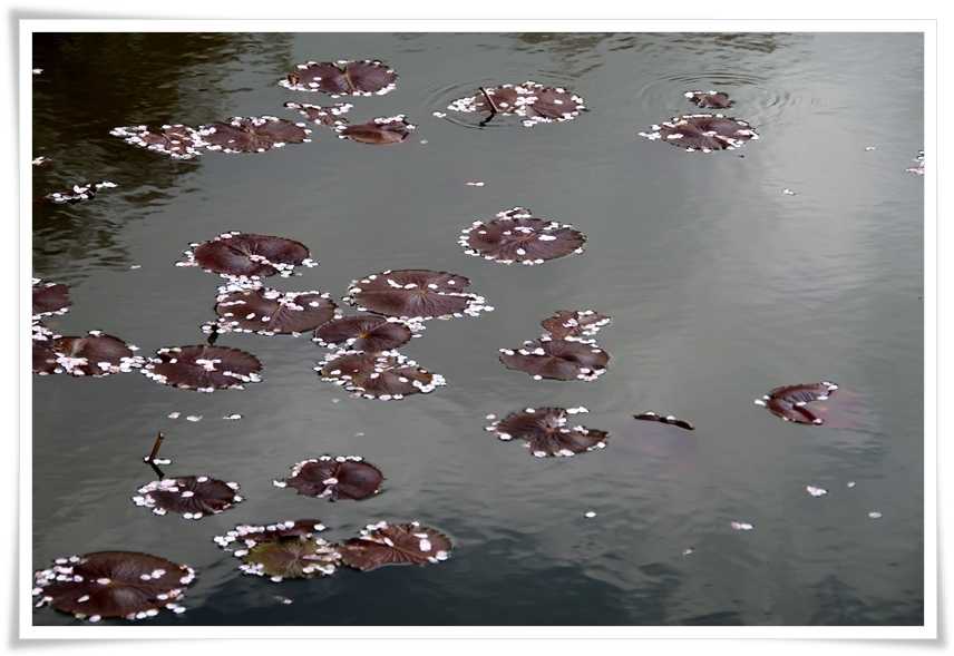 池の中に生えている スイレン の葉っぱの周りにも花びらが・・・・・・・