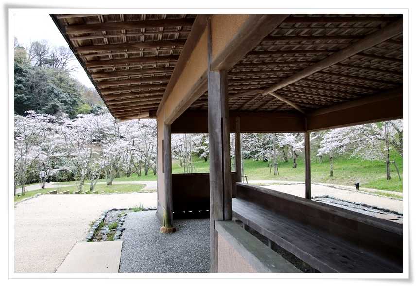四阿の中から見る 紅枝垂れ はまだまだ綺麗な様子のようです
