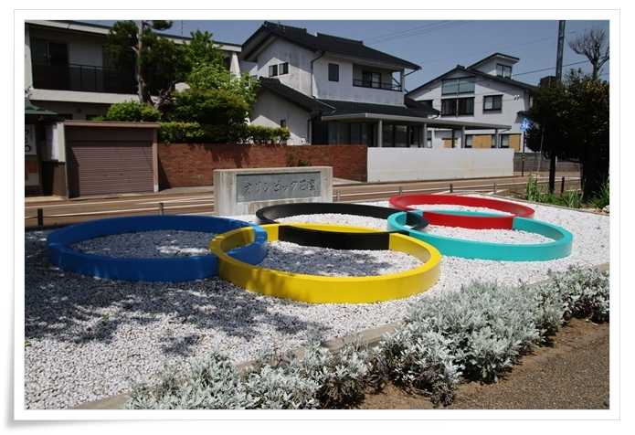 白い砂利が敷き詰められた上に五輪のモニュメントがあります
