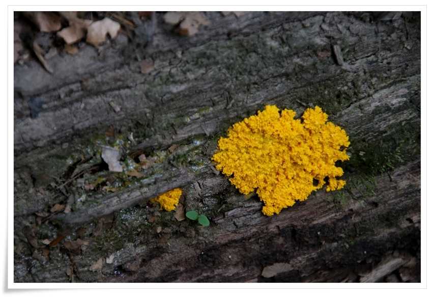 こちらの倒木の上に有る鮮やかな黄色は ​粘菌​