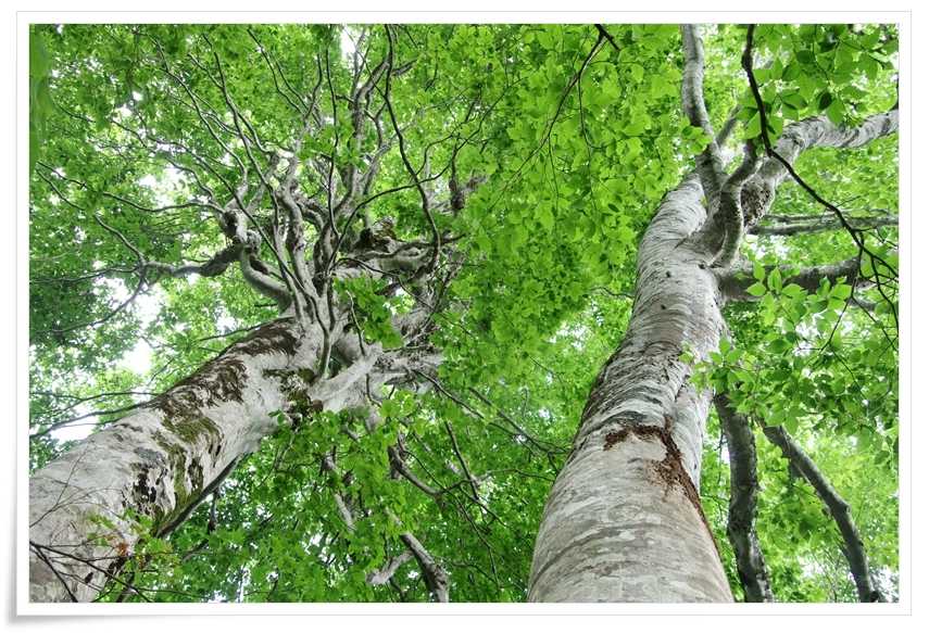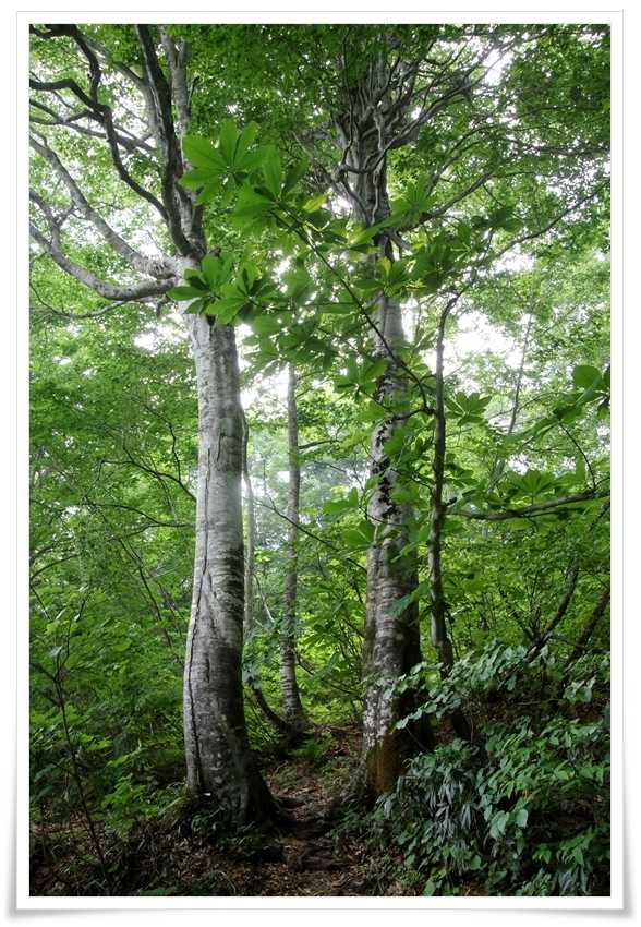 門のようにそびえたつブナの下に立って見上げるとこんな感じです