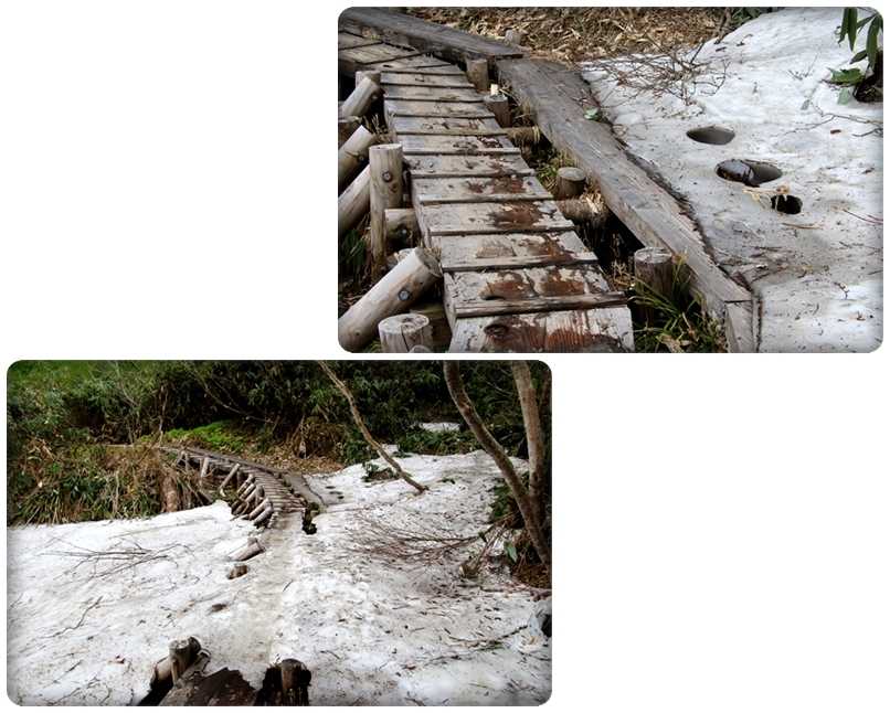 残った雪は踏み固められて木道の上は滑りやすくなっています