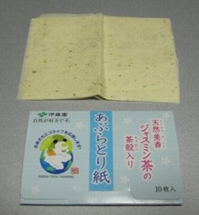 天然美香ジャスミン茶の500mlPETに「天然美香ジャスミン茶の茶殻入りあぶらとり紙」が付いてました。10枚入り。前はお~いお茶の茶殻入りでしたね。いろんな茶殻のあぶらとり紙、いいですね。