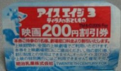 明治乳業THE COFFEE MILKに「アイスエイジ3 ティラノのおとしもの 映画200円割引券」が付いてました。これは割引券が目当てではなく、買った飲料にたまたま付いてたって感じなんですけどね。せっかくだから紹介しておきます。アイスエイジの1はテレビで見たことあり、結構面白かったです。もし何か映画を見ることになったら、これは候補になるかな。割引券もあることだしね。