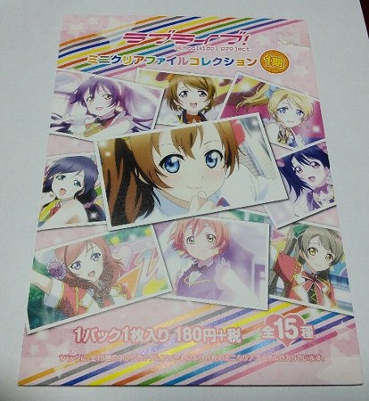 「ラブライブ! ミニクリアファイルコレクション 1期」全15種類。好きな回って特にないからどれでもいいかなって思ってたら「まきりんぱな」でした。第4話の1年生回だね。