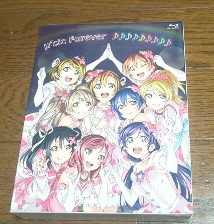 ラブライブ!μ'sのファイナルライブ「μ's Final LoveLive! ~μ'sic Forever~」のBlu-rayが発売。 2日間の6枚組のMemorial BOXを購入。特典は「ブロマイドホルダー+LIVE写真のL判ブロマイド」ホルダーは各メンバー絵柄、ブロマイドは各キャストのLIVE写真。店舗ごとにメンバーが違います。普段は特典付きは定価なので買わないけど、今回は各メンバーだから買わないとっていう想いと、何より最後だからね。ラブライブの映像はこれで最後。奮発しちゃった。園田海未ver.のHMVで購入。私はキャラとキャストの押しが一致してるからいいけど、違う人はどっちを優先するか迷っただろうな。2日目のライブビューイングに行って半年。早く見たかった。特に海未ちゃんセンターの「だってだって噫無情」とダンスがすごかったlily white。計10時間なので見応えあった。やっぱり噫無情かっこよかった~。2日間あるので、撮り方が違ってていいよね。